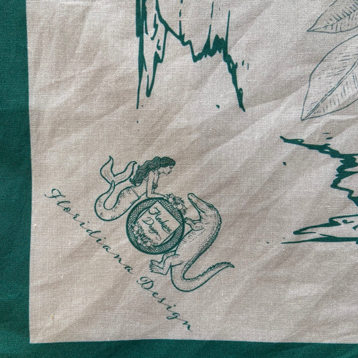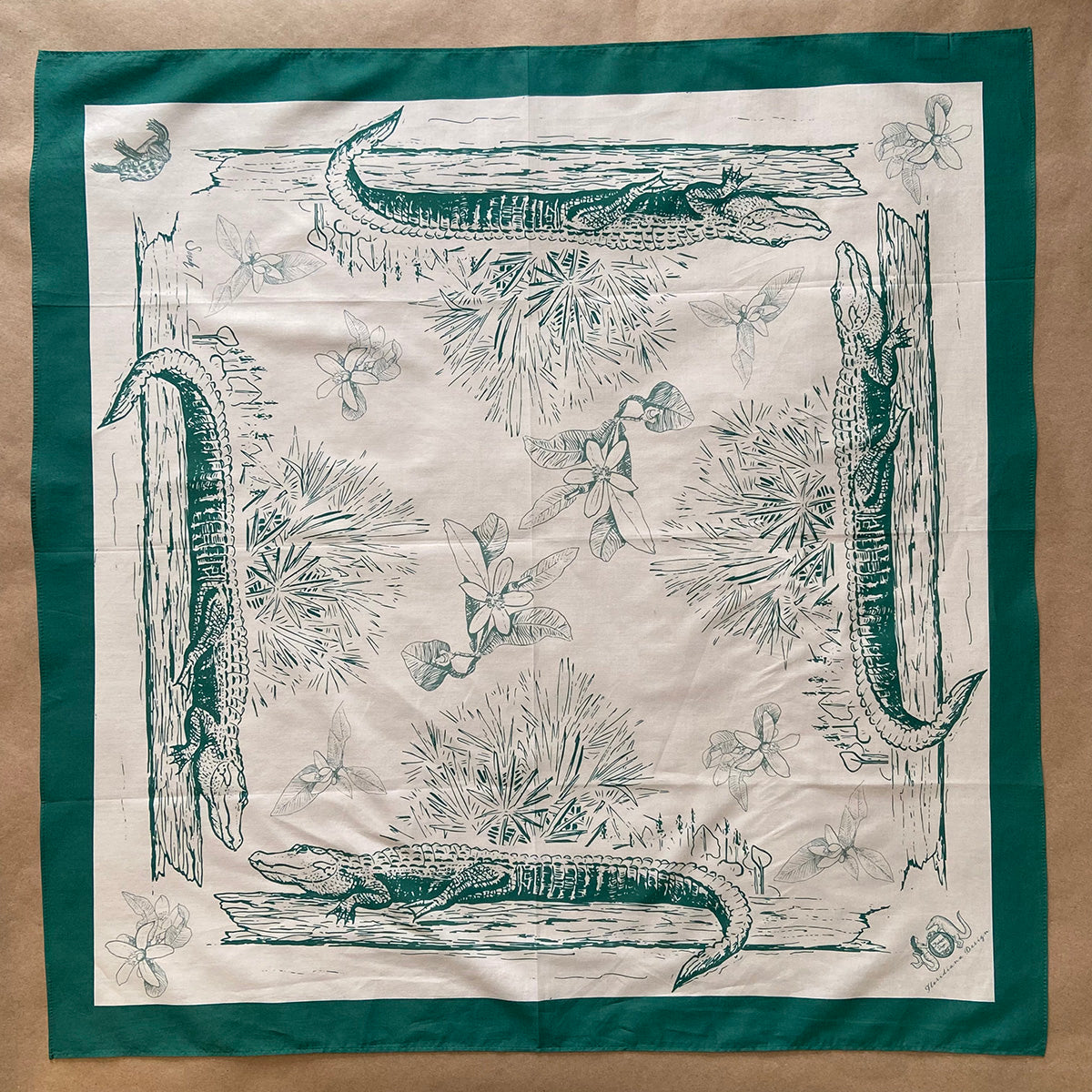 This vintage style two tone green and cream scarf is inspired by the Florida alligator, a very prolific and fascinating neighbor of mine. The original hand-drawn elements as well as the graphic design were created by me! It depicts a motif of four large alligators, one along each edge of the scarf, along with blooming pickerelweeds and saw palmettos. Orange blossoms decorate the middle and two corners of the scarf. On the third corner swims a yellow-bellied slider turtle and on the fourth corner is my Floridiana Design logo of a mermaid and alligator.